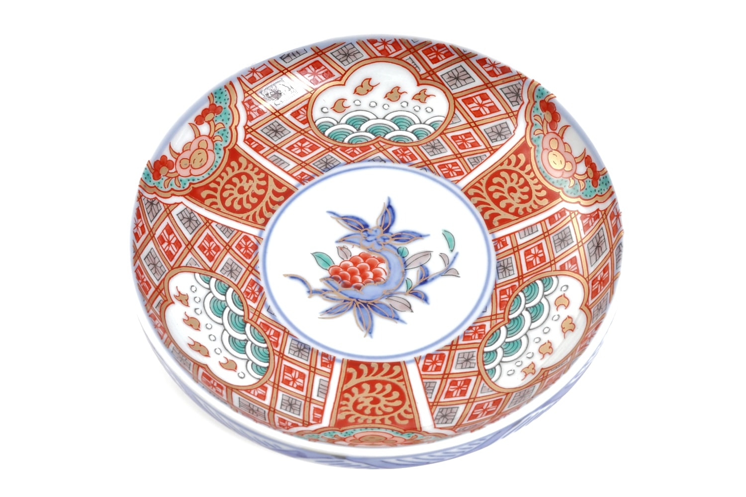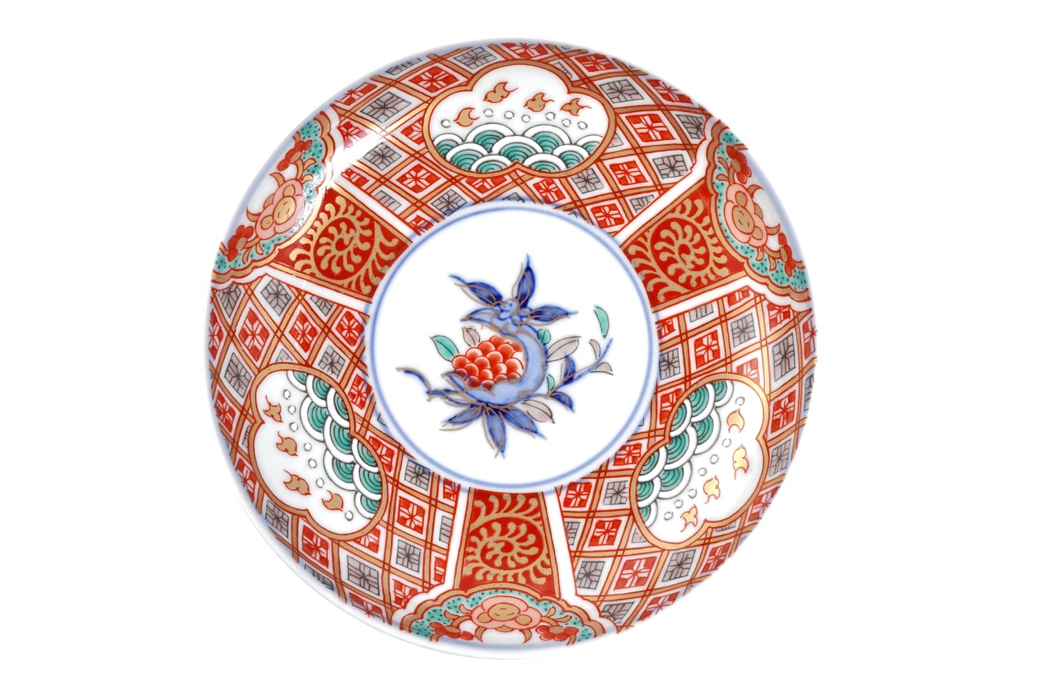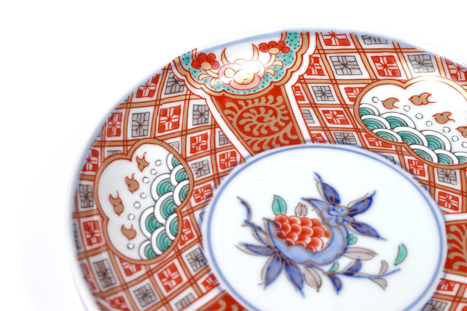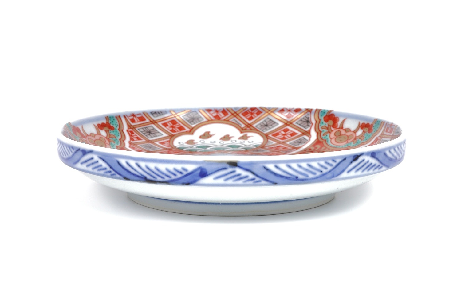 こちらは林九郎窯が手がけた「千鳥拓榴紋銘々皿」です。このお皿は、繊細な千鳥と拓榴のモチーフが特徴的で、古伊万里の伝統的な意匠を取り入れた美しいデザインが施されています。皿の中央には、鮮やかな朱色と青色の千鳥が描かれ、その周囲には拓榴の紋様が緻密に描かれています。縁取りには、格子状のパターンと共に海波や雲の模様があしらわれ、古典的な日本の美学が際立つ仕上がりとなっています。裏側には「林九郎作」の銘があり、窯元の誇りと伝統を感じさせる一品です。この銘々皿は、個別の料理を引き立てるのに最適で、和食の席を一層華やかに彩ります。細部まで丁寧に描かれた絵付けと、上品な色使いが特徴で、贈り物や特別な席での使用にもぴったりです。これにより、林九郎窯の高い技術と美意識を感じ取ることができる、美術工芸品としても価値のあるお皿です。