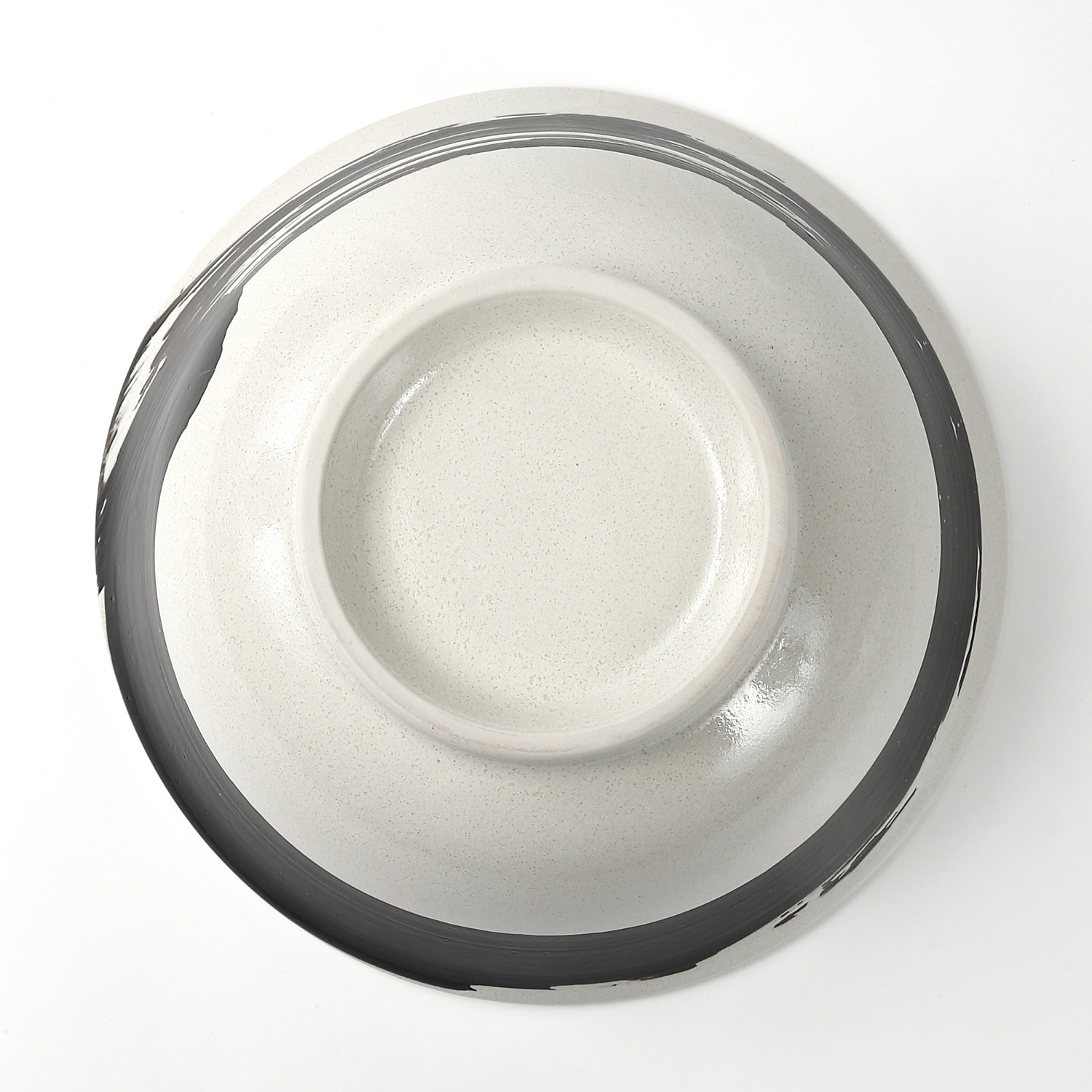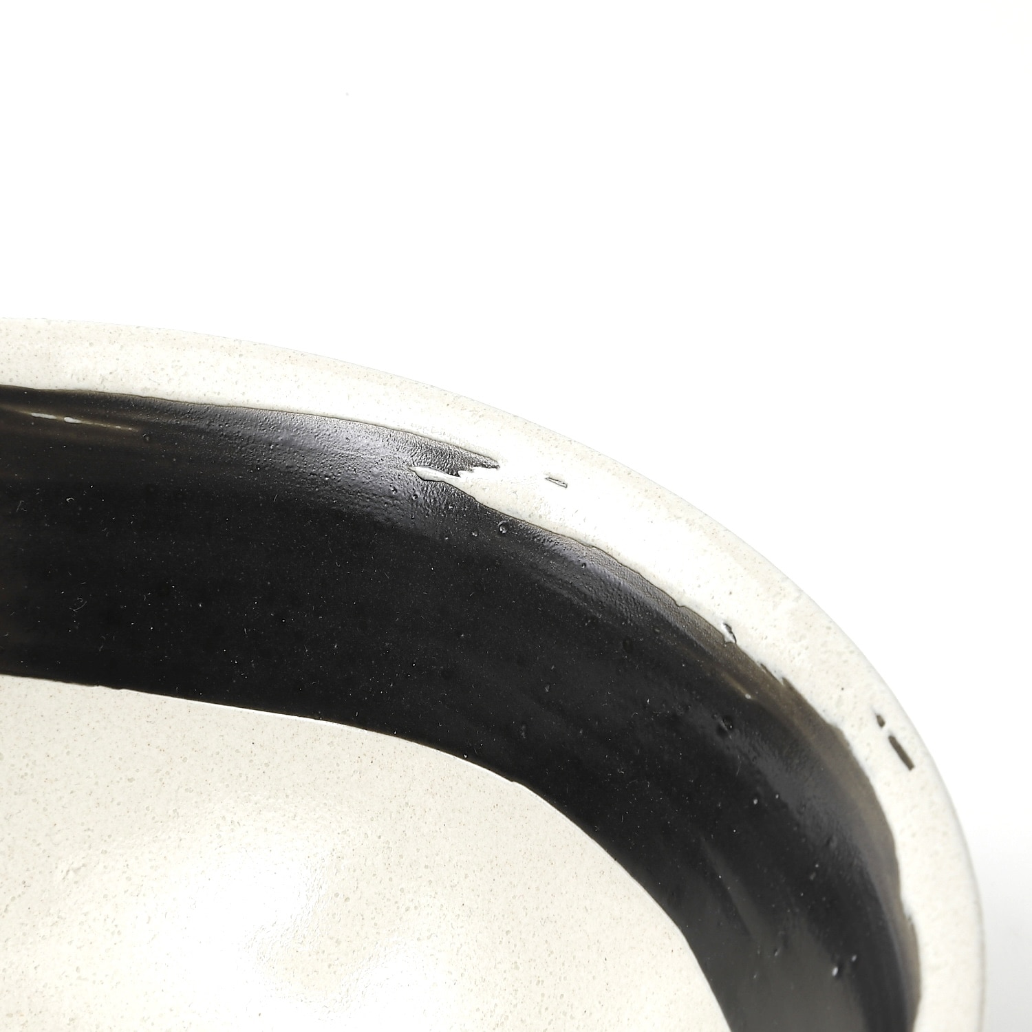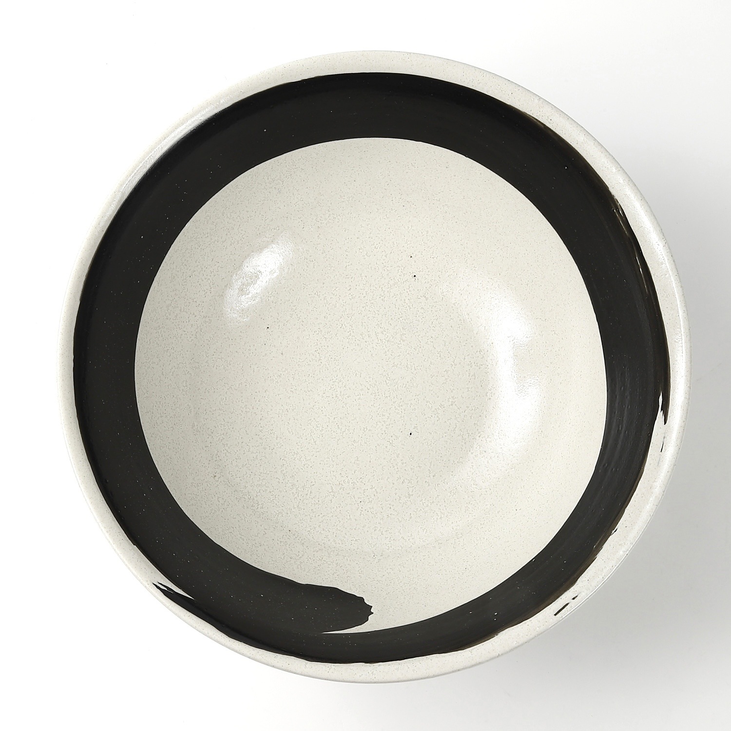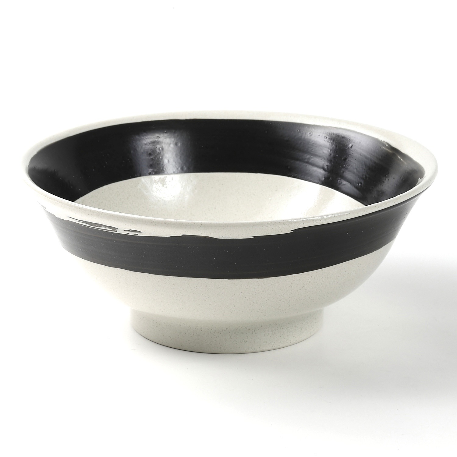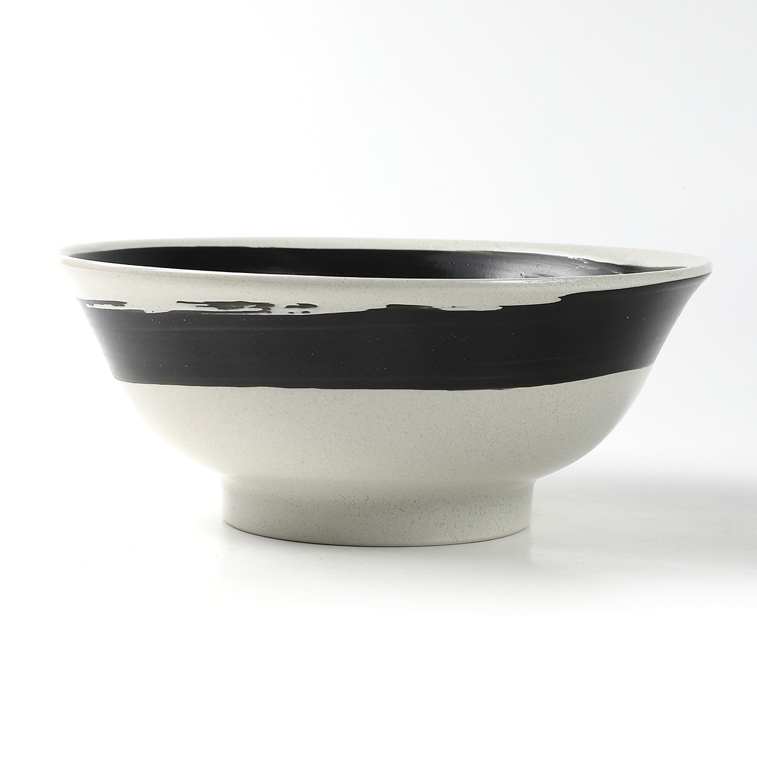 白地に大胆な黒の刷毛目を巻いた、モダンで力強い印象の大ぶり丼です。直径約21.2cmの広口タイプで、ラーメンやうどん、丼ものなどに最適。高台があることで安定感があり、盛り付けが映える形状です。和にも洋にも合うシンプルながら存在感のあるデザインで、日常使いから飲食店の器としても活躍する実用性の高い一品です。